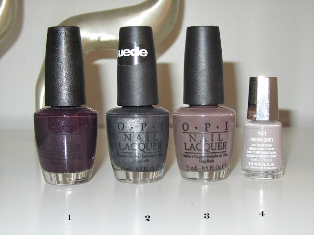 1. OPI - Lincoln Park at Midnight (väri on luonnossa hiukan tummempi, lähes musta) 2. OPI - Suzi Skis in the Pyrenees Suede (jättää hauskan mattaglitter-pinnan, ellei käytä kiiltoa tuovaa päällyslakkaa) 3. OPI - You Don't Know Jacques! (luonnossa hiukan tummempi ruskea kuin kuvassa) 4. Mavala - Moon Grey (ei paras mahdollinen levittyvyys, osin luultavasti lyhyen siveltimen vuoksi, mutta ihana vaaleanharmaa väri). Kaikkien OPIn lakkojen väri on lähempänä aitoa ylemmässä kuvassa.
