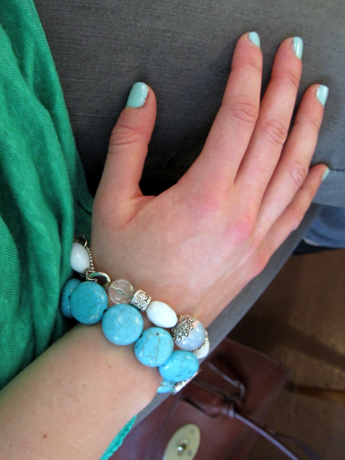 Yksityiskohta päivän asusta. Rannekorut/ Snö of Sweden ja toinen Zurichistä jostakin pikkukaupasta.
