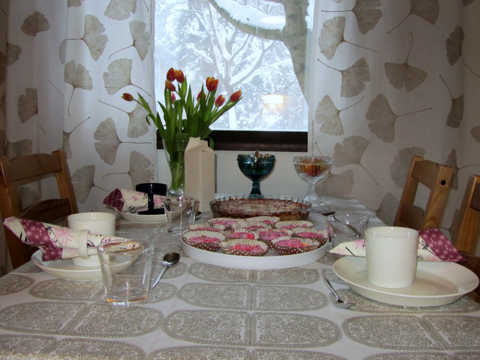 Yllä kuva ystävänpäivän kahvikattauksesta: leivoin bebe-leivoksia ja quiche lorraine- piiraan. Noiden bebe-leivosten tekeminen hiukan jännitti, koska en ollut koskaan aiemmin tullut edes ajattelleeksi, että niitäkin voisi tehdä itse ;) Ulkonäkö ei ole ihan yhtä taidokas kuin kaupasta ostettu, mutta maku oli onneksi oikea ja siis herkullinen- ystäväni mukaan jopa parempi kuin kaupan/leipomoiden bebeissä :) Ja quiche hävisi sen sileän tien paremiin suihin. Lupasin aiemmin kuvia prosessista, mutta ikävä kyllä leipomusten kanssa tuli sen verran kiire, että välillä en ehtinyt kuvailemaan; huomasin mm. piiraan täytettä sekoittaessani, että mustapippuri on loppu! Argh, ei auttanut muu kuin kipaista lähikauppaan...