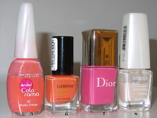 5. Maybelline Mini Colorama - Punky Orange (aloin himoita kirkkaita lakkoja, ensimmäisen kerran sitten teinivuosien sinisten ja vihreiden, vasta viime keväänä ja tämä korallinen mattaoranssi oli ensimmäinen ostos) 6. Lumene Natural Code - Groovy (tästä jo näittekin kuvia in action, ihanan kirkas ja täydellinen perusoranssi) 7. Dior - Rose Kimono (Still loving it! Mutta olin oikeassa keston suhteen: se on samaa luokkaa OPIn lakkojen kanssa eli hyvä, mutta ei erityisen poikkeuksellinen.) 8. Isadora Wonder Nail - Second Nail (Iän myötä kynteni ovat alkaneet liuskoittumaan ja ostin siksi tämän ensimmäisen kynttä hoitavan lakkani syksyllä. Se paitsi auttaa parantamaan kynnen kuntoa, myös antaa upean kiillon- ja on paras kokeilemani nudelakka.)