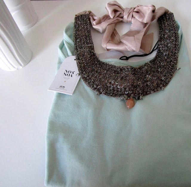 Pastelliväreistä puheen ollen: kävin tänään lounaalla ystäväni kanssa Kluuvin Versossa ja paluumatkalla käväisin Noa Noassa. Eilen en (vieläkään) löytänyt mitään sopivaa mintunvihreää, vaikka väri on ollut himotuslistalla jo muutaman kuukauden. Tänään kuitenkin Noa Noan ovi veti puoleensa ja tuota, juuri oikean väristä, toppia en mitenkään voinut jättää kauppaan. Minusta myös tuo statement-kaulakoru oli oikea löytö! Sopii ihanasti kesän pastelliteemaan ja käy yhdistettäväksi kaiken kanssa. <3