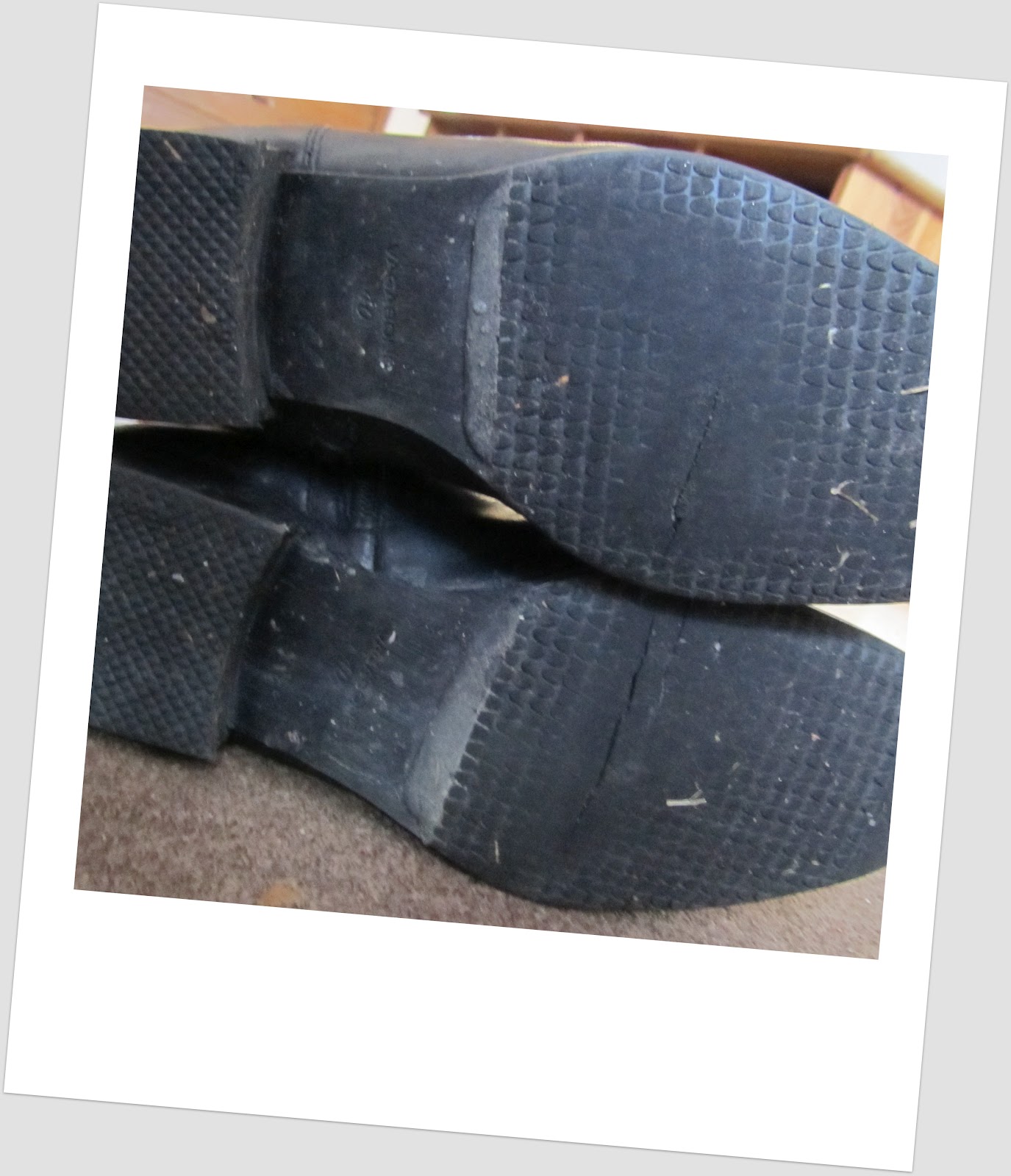Muistatko kun tammikuussa kerroin rakkaista Vagabondin saappaistani, joista en millään malttaisi luopua, mutta joiden arvelin joutuvan eläkkeelle ensi syksynä..? No, kävi ilmi että olin väärässä ja joudunkin kenkäostoksille heti. Olen jo muutaman viikon ajan ihmetellyt, miten nämä kosteussuojatut nahkakenkäni, jotka siis periaatteessa pitävät kosteutta ihan kohtuullisesti, ovat viime aikoina alkaneet oudosti olla märät pohjista kun riisun ne jalasta. Samaan aikaan on kuitenkin ollut todella loskaista ja sateista, joten ajattelin vain, että kaipa siitä pohjan ja nahan välistä jotenkin sitten pääsee vettä näillä keleillä. Noh, eilen tajusin vihdoin kääntää kengät ympäri ja kurkata kunnolla pohjia.