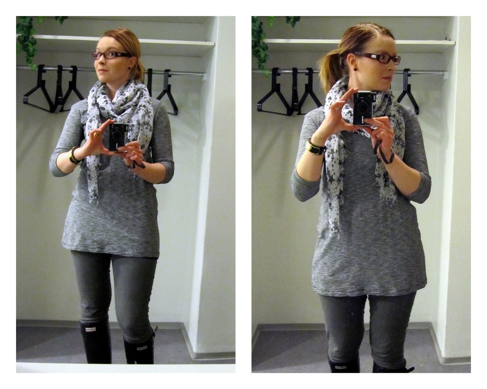 paita/ Vero Moda, legginsit/ Riikasta, huivi/ GT, saappaat/Hunter, korvakorut/ H&M