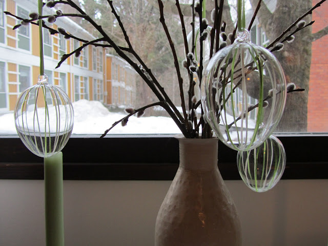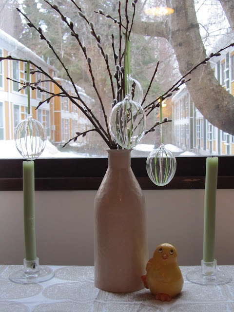 Tein oksista pienen asetelman pöydälle. Tipun olen joskus saanut lahjaksi, lasiset munat ovat Pentikin. Kynttilät ja kynttilänjalat Ikeasta, pöytäliina Marimekon. Maljakko taitaa olla Prismasta.