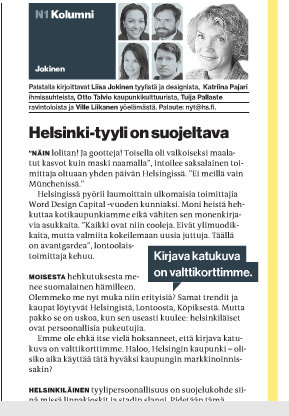 Hel-Looks- katumuotisivuston toinen perustaja Liisa Jokinen kirjoittaa tänään Helsingin Sanomien Nyt-liitteen kolumnissaan World Design Capital- vuoden kunniaksi maahan tulleista ulkomaalaisista toimittajista, jotka ihastelevat helsinkiläisten monipuolista pukeutusmityyliä. Kirjoituksen ideana on rohkaista suomalaisia pukeutumaan edelleen aidon persoonallisesti: jokainen omalla tyylillään eikä jokainen samalla tavalla "persoonallisesti". Jokinen kirjoittaa: "Helsinkiläinen tyylipersoonallisuus on suojelukohde (...) Älkäämme edes yrittäkö olla ruotsalaisen tasapaksuja ja tyylikkäitä. Annetaan kaikkien tyylikukkien kukkia. Ollaan ylpeitä punkkareista, j-poppareista, muotifriikeistä ja Hakaniemen torin harmaista mummeleista. Kehu kaverin asu ja yllytä äiti kokeilemaan uusia komboja. Mitä persoonallisempia, sen parempi."