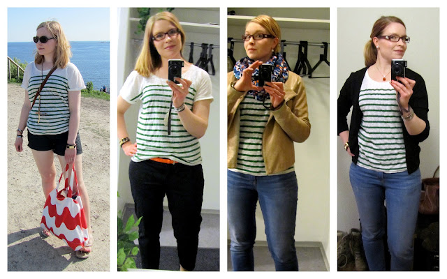 Kuten eilen mainitsin, tuota Lindexin Holly&Whyte T-paitaa olen tosiaan käyttänyt paljon tänä keväänä. Kävin läpi paidan ostamisen jälkeen ottamani asukuvat ja löysin neljä erilaista yhdistelmää joissa tuo paita on ollut. (Eikä kaikkia versioita ole kuvattu blogiin.)