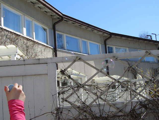 Ensimmäinen kunnollinen auringonlämmössä paistattelu ulkona:) Onneksi sain ystävältäni aurinkorasvaa, ettei tullut myös kesän ensimmäistä palamista... Mä olen tosiaan niin vaalea, että suorassa auringossa keskipäivän aikaan 10 minuuttia saattaa riittää palamiseen. Muistakaahan muutkin rasvaaminen! Pitää käydä heti huomenna ostamassa uutta: kesä alkaa mulla suojakertoimella 50, loppukesästä "höllään" kahteenkymppiin...