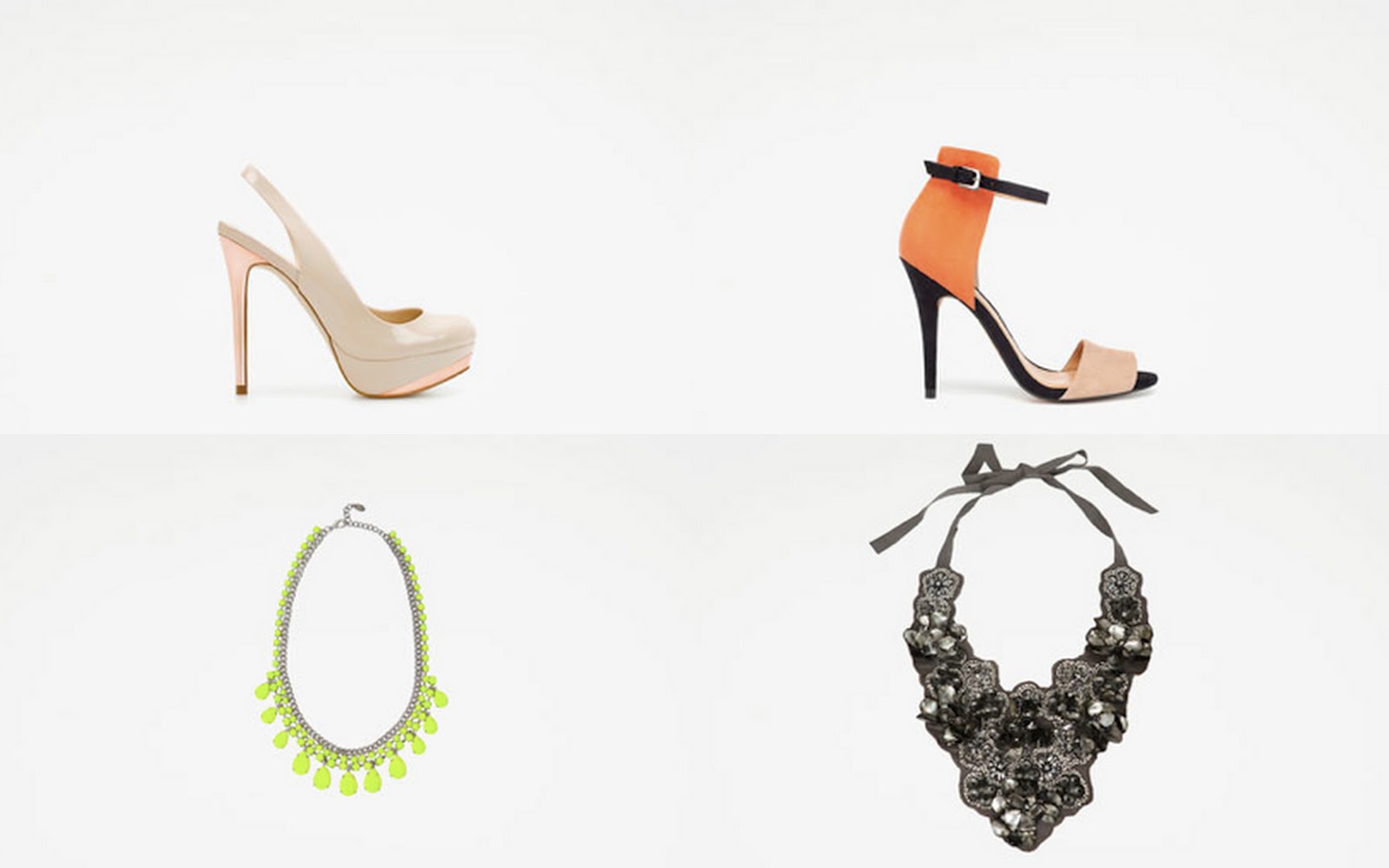 Zaran asustepuolella löytyy herkkuja myös: olen parhaillaan etsimässä nudeja korkokenkiä ja Zarallakin oli tuo yksi kivannäköinen vaihtoehto. Nuo oikean yläkulman korkkarit ovat näkyneet monissa blogeissa eri väreissä ja ovat kyllä aika ihanat...neon-trendiin pääsisi helposti vielä mukaan tuolla kaulakorulla. Ja mustalla tosiaan syksyyn: aika saman tyylinen kuin Lindexille tulossa oleva koru.