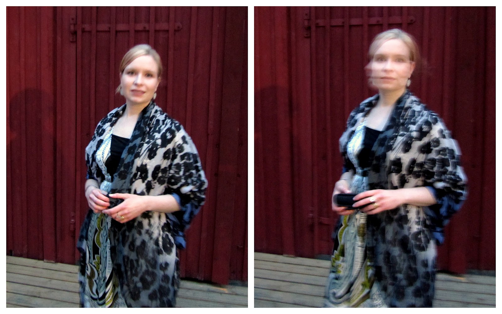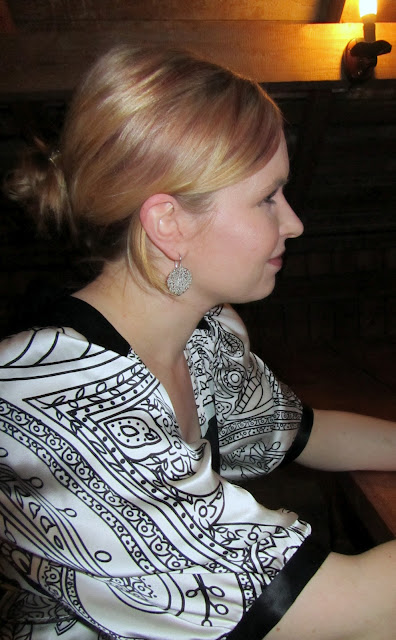 Asukuviin kerkesin tällä kertaa vasta hiukan myöhemmin illalla. Kuvasta näkyy että päädyin mekon seuraksi valitsemaan vuosia sitten lahjaksi saamani hopeisen rannerenkaan ja Joid'art- merkin korvakorut.