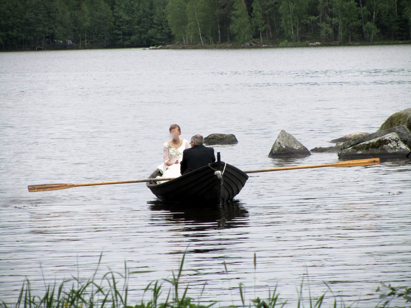 Morsian saapui idyllisesti vihkipaikalle isänsä soutamalla soutuveneellä. Itse en kyllä olisi uskaltanut, olisin aivan varmahti keikahtanut jokeen... mutta tällä parilla kaikki sujui hyvin :) Pari oli myös opetellut ulkoa kauniin runon, jonka he lausuivat toisilleen ennen vihkimisen alkua. En olisi itse siinä tilanteessa saanut suustani yhtään mitään muuta kuin sen yhden vaaditun sanan, siksi meillä ei todellakaan ollut mitään sormusvaloja omassa kaavassamme... Mutta toimitus runoineen oli erittäin koskettava ja tästä parista huokuu ihan erityinen kumppanuus. Onnea ystävät, vielä kerran <3