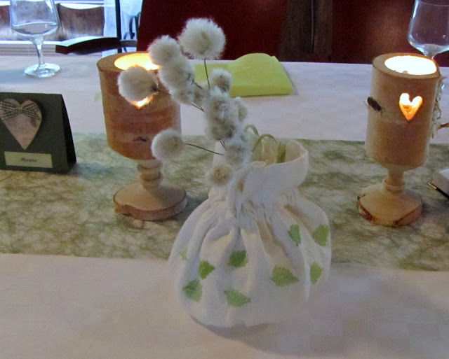Morsiamelle ei ollut kukkakimppua, vaan tyyliin sopivasti kuvassa oleva suloinen pussukka. Sulhasen isä oli valmistanut upeita koivuisia koristeita, mm. hääparin pöydällä olleet tuikkupikarit sekä pöydissä olleet koivuiset asetelmat.