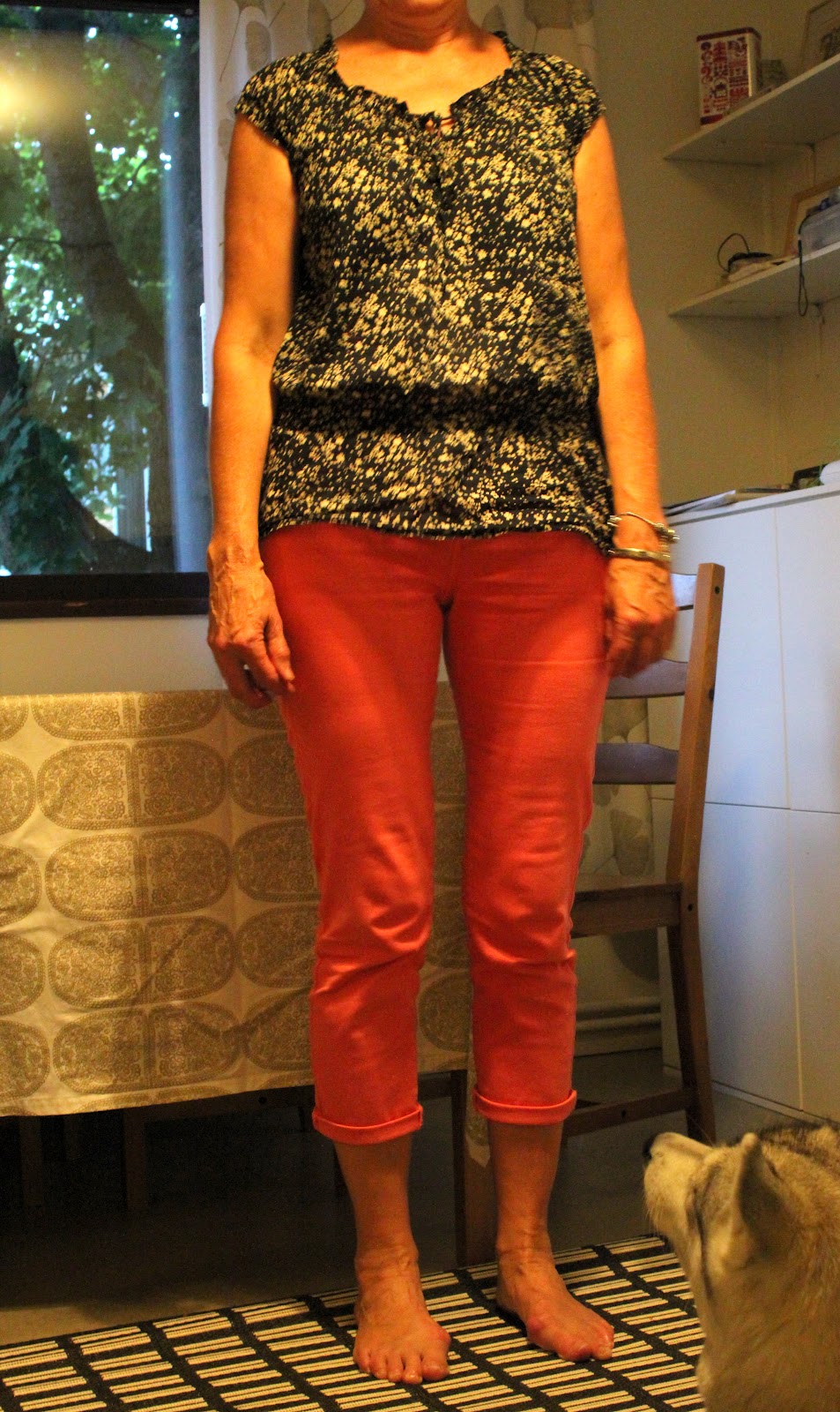 Lisäksi alla ystäväni toiveesta kuva äitini päivän asusta :) Olin maininnut, miten makeasti äidilleni mielestäni sopivat pinkit housut. Itse koen oman takapuoli/reisiosastoni olevan sen verran muhkea, että en tarvitse siihen lisähuomiota kirkkaan värisillä housuilla. Mutta äidin päällä näyttävät upeilta, wouldn't you agree?
